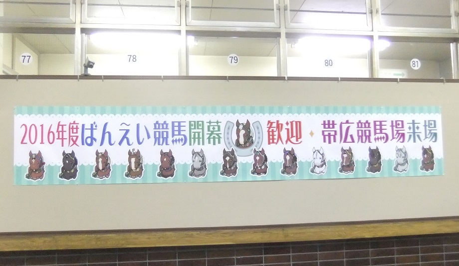 ばんえい競馬新年度開催にあたり、来場歓迎の横断幕を帯広競馬場中央通路にある当会掲示板に張り出しました。デザインは、お馴染みのイラストレーター「らんさん」。縦60センチ×横360センチの大型横断幕には、昨年度の重賞勝馬15頭が勢揃い。開幕からゴールデンウィーク明けまで、来場者をお出迎えいたしました。