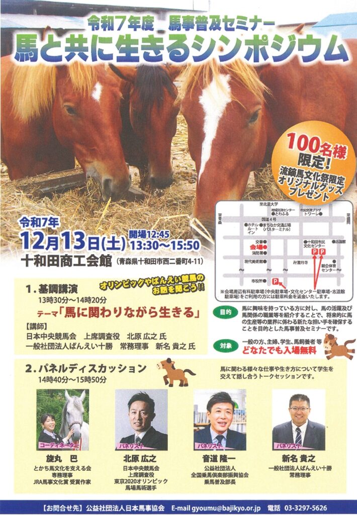 2023年から日本馬事協会主催、当会共催で開催している馬事普及セミナー。今年は、桜流鏑馬などで知られる馬事先進地=青森県十和田市で開催いたしました。開催数日前の地震や、折からの大雪や吹雪など、数々のトラブルの中、当初参加予定だった一般社団法人ばんえい十勝の新名常務理事も、搭乗便欠航で欠席となりましたが、当会から参加した5名は、何とか現地に到着し、無事開催の運びとなりました。