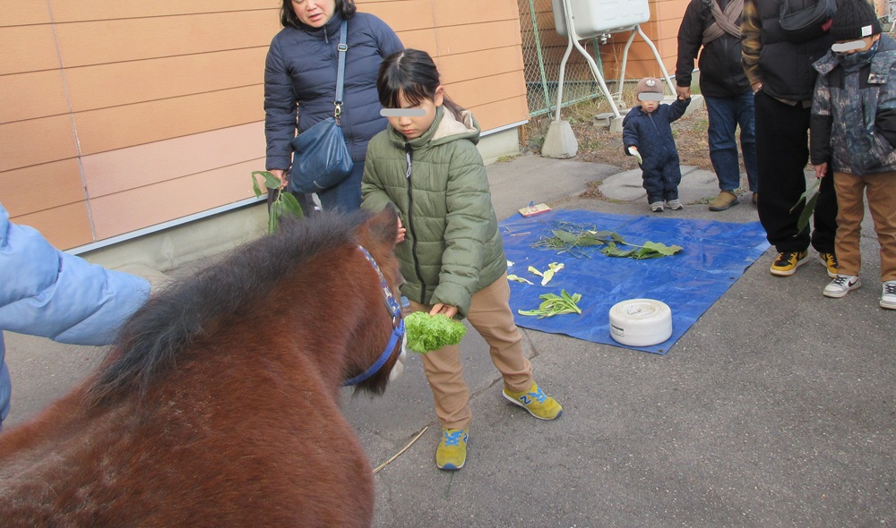 午後は、エクレアの気分転換のためもあって、「ポニーの食べないもの当てクイズ」を実施。並べられた草や野菜などの中から、ポニーが「食べないもの」と思う食べ物を各自、選んでもらい、それをエクレアにあげて、食べなければ当たり! 商品として馬シールを贈呈。