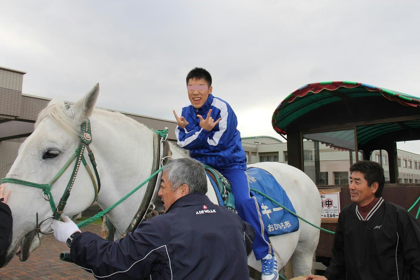 その後は、玄関前に出て馬車体験や乗馬体験など、馬とのふれあい授業に。ミルキーの穏やかな表情に、「可愛い!」と歓声をあげるなど、寒風吹きすさぶ中でも、全員が終始、満面の笑みを浮かべてくれました。