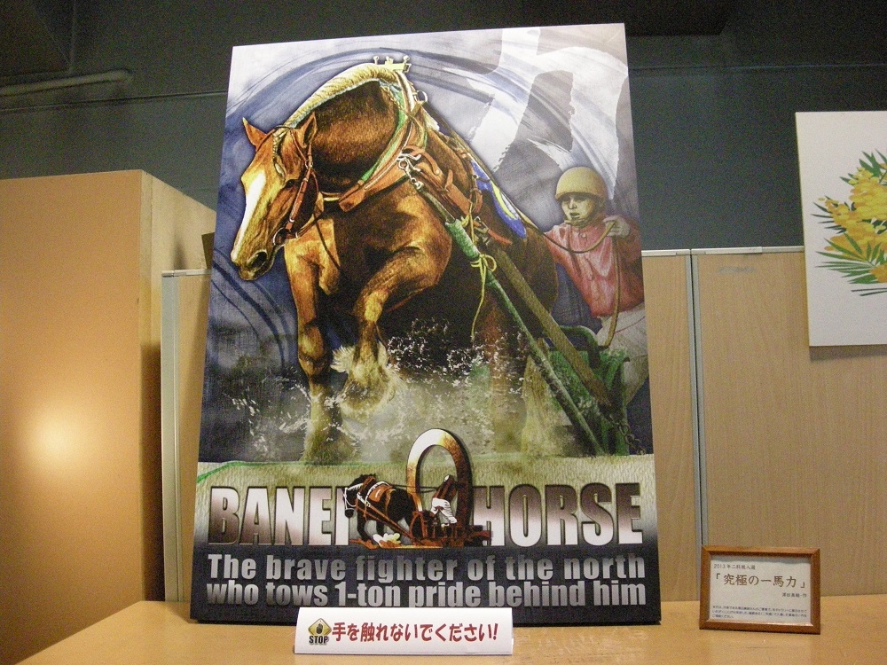 2014年2月12日 umabunka 二科展入選作がばんえいギャラリーに 1月末まで市民写真展を開催していた帯広競馬場スタンド入口横の「ばんえいギャラリー」ですが、2月からは二科展入選作品を展示。ご覧の通りの大型パネルに美装された同作は、その名も「究極の一馬力」。ばんえい競馬の力強さ凝縮された迫力の作品です。 今回、作者の澤田真結さんのご厚意で、帯広競馬場での展示が実現しました。ばんえい記念の翌日(今年度開催最終日)まで展示する予定ですので、ご来場の際は、是非、同作の魅力をご堪能ください。