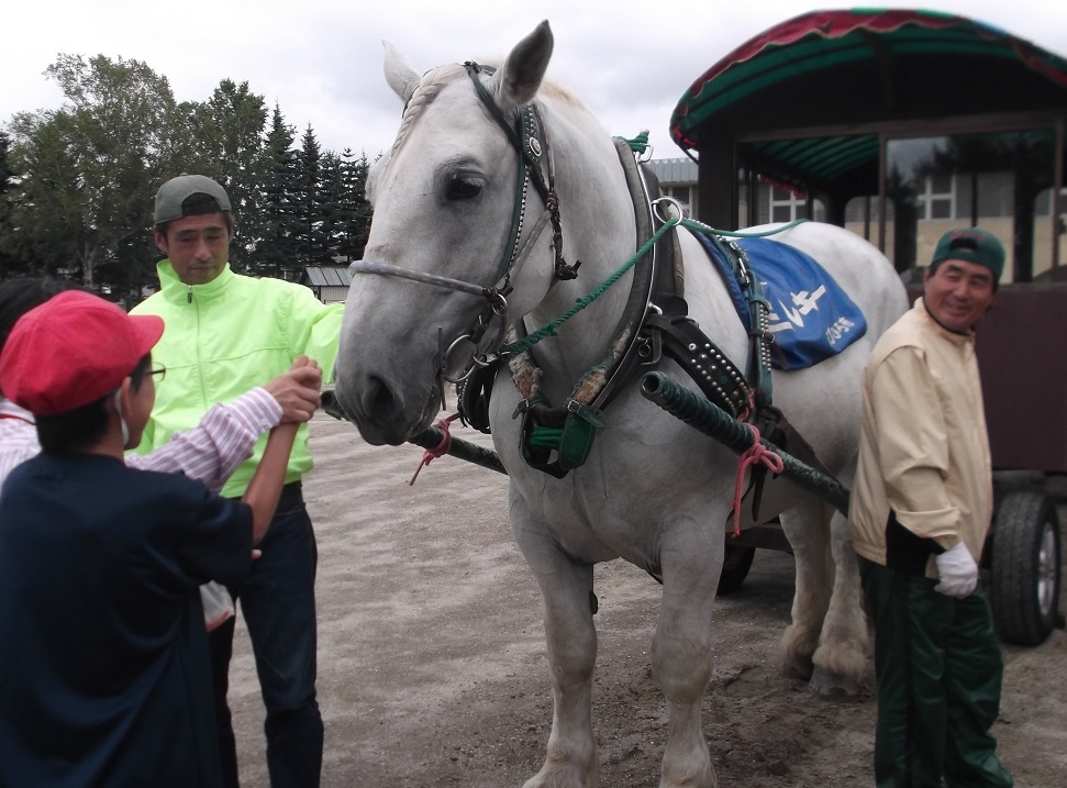 そして、3時間目は、馬とのふれあい学習。最初に、障がいを持つ子供たちの学級「すずらん学級」4名がミルキー馬車に。馬車に吹き込む秋風などを感じ、みんな笑顔を見せてくれました。すずらん学級に続いて5年生、1年生も馬車体験。1年生は、その後にミルキーにまたがったり、ニンジンをあげたりと、急ぎ足ではありましたが、ミルキーとのふれあいを楽しみました。